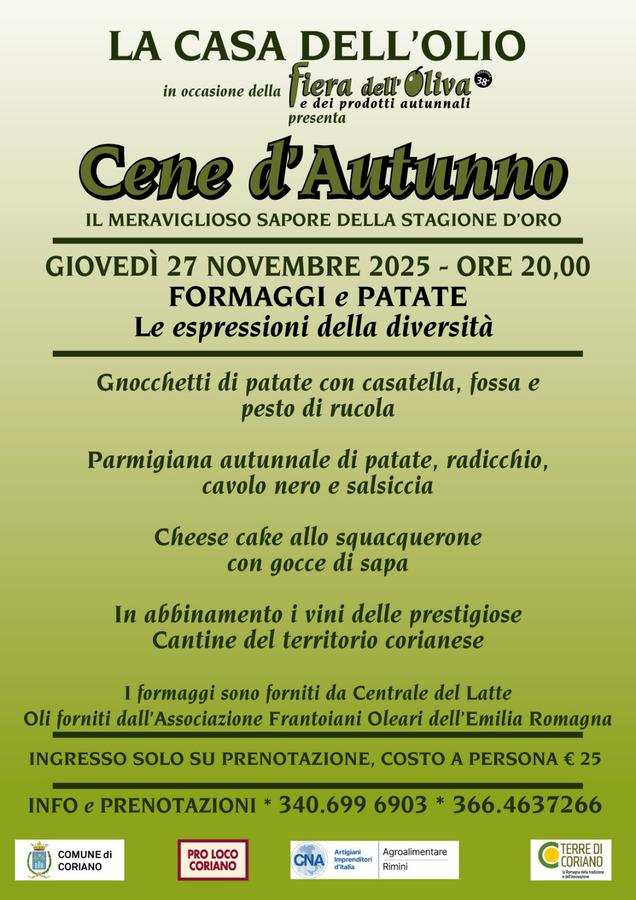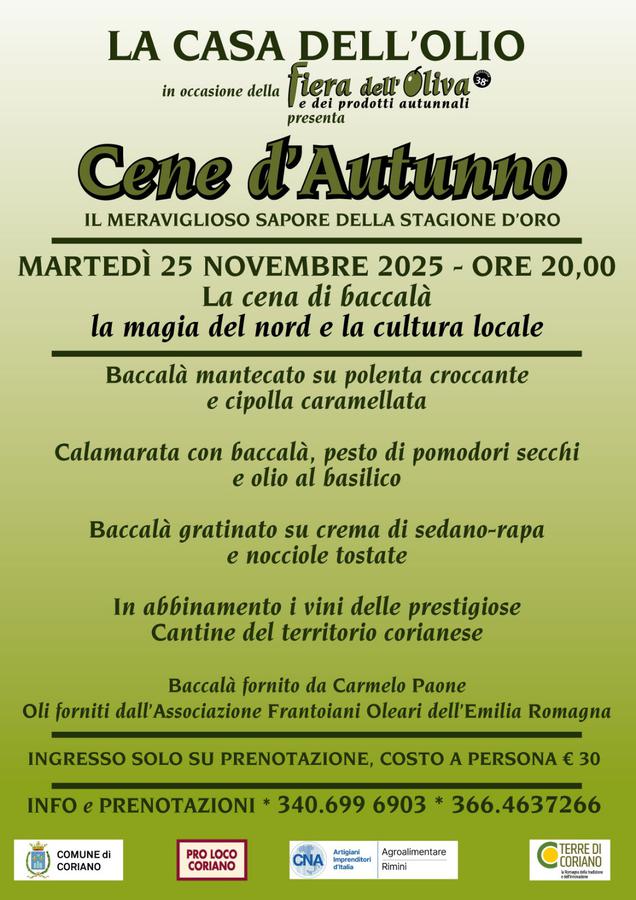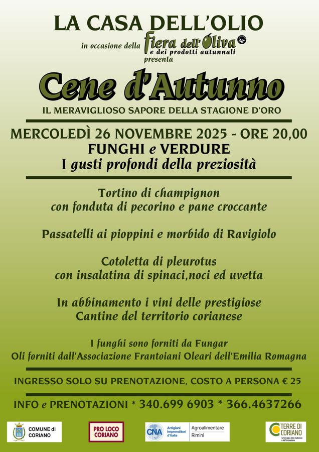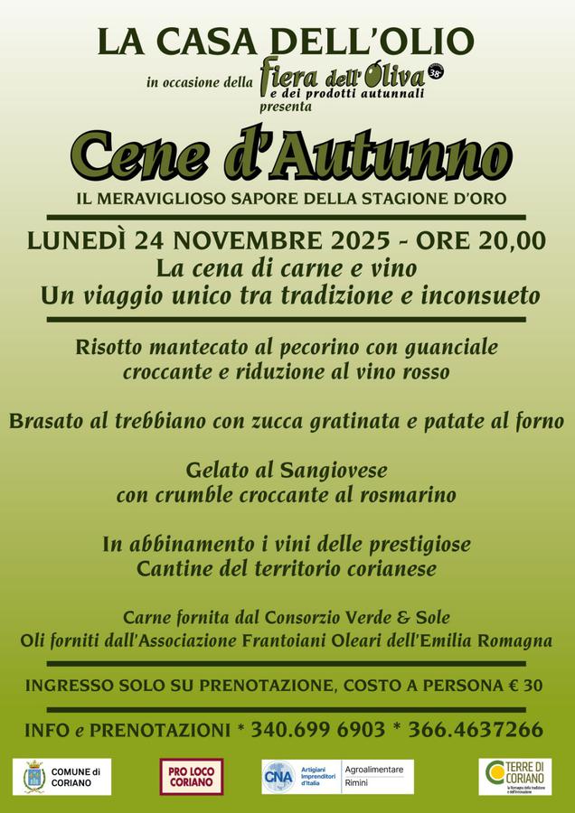 Inoltre nelle 4 serate dal 24 al 27 novembre Cene d'autunno presso la Casa dell'Olio con menù costruiti su prodotti tipici stagionali e territoriali e abbinamenti con i vini delle prestigiose cantine del territorio corianese.