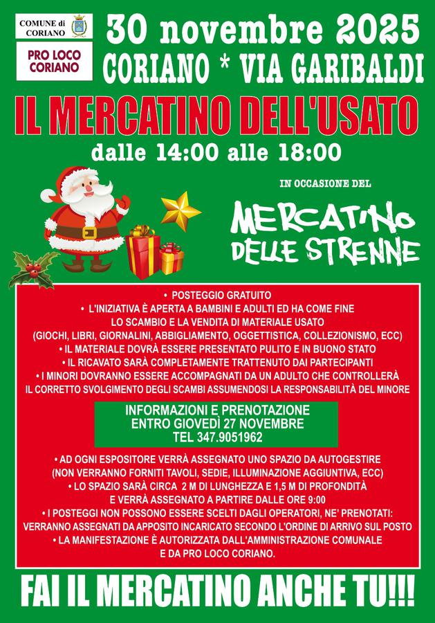 Dalle ore 14.00 Mercatini di artigianato, hobbisti, oggettistica natalizia. Mercatino dell'usato*.