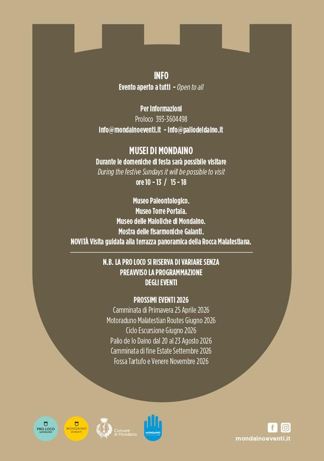 Nei giorni della manifestazione sarà possibile visitare il Museo Paleontologico sito in Piazza Maggiore n. 1 e la Mostra delle Maioliche Mondainesi in Via Levante.