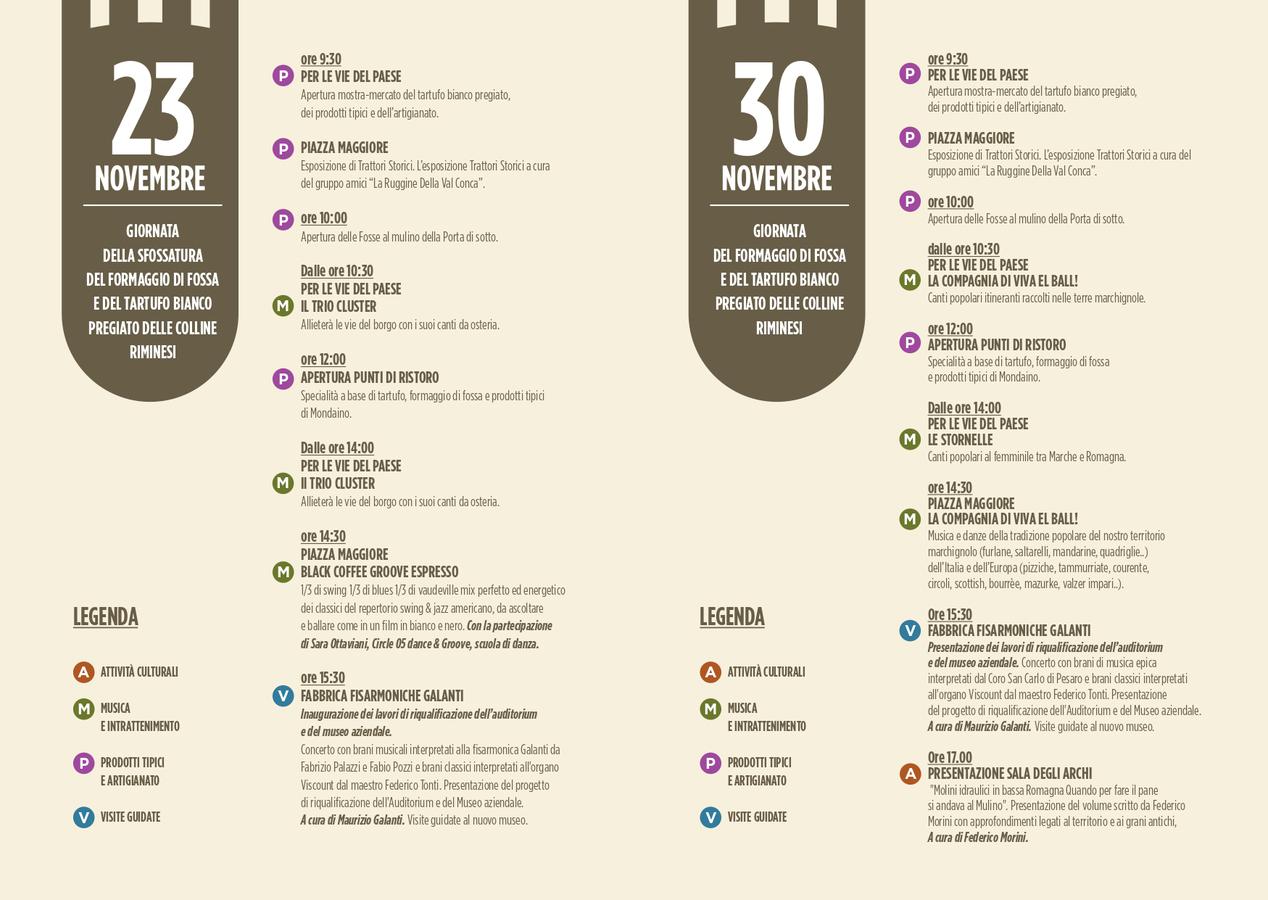 Sono due le qualità di tartufo che costituiscono il vanto delle colline riminesi e del territorio mondainese in particolare: il bianco pregiato e il nero. Gli amanti di questo prezioso tubero potranno apprezzarlo, servito in menù tematici, nelle osterie appositamente adibite per la manifestazione, nei ristoranti e negli agriturismi di Mondaino e dintorni.