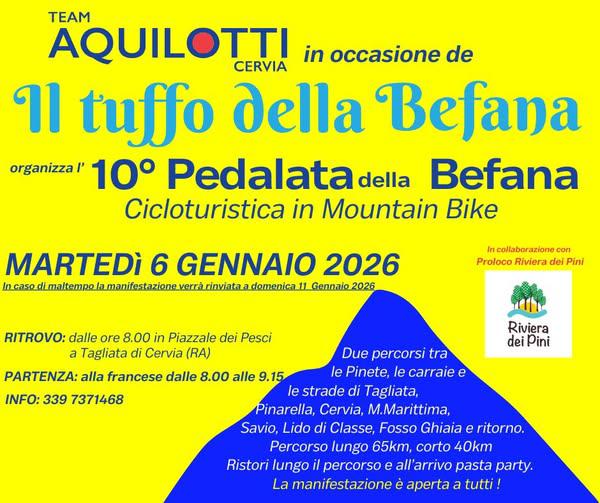- ore 8:00–9:15: Pedalata della Befana, organizzata dal team Aquilotti di Cervia. Percorso lungo 65 km e breve da 40 km