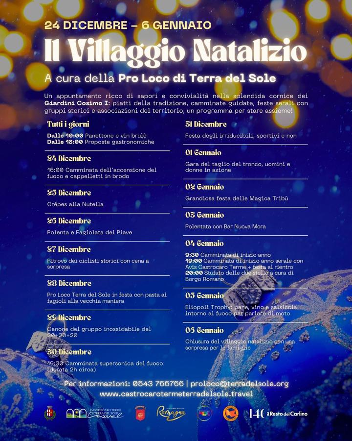 La Pro Loco di Terra del Sole presenta il Villaggio Natalizio, un appuntamento ricco di sapori e convivialità nella splendida cornice dei Giardini Cosimo I: piatti della tradizione, camminate guidate, feste serali con gruppi storici e associazioni del territorio, un programma per vivere insieme il periodo delle feste.