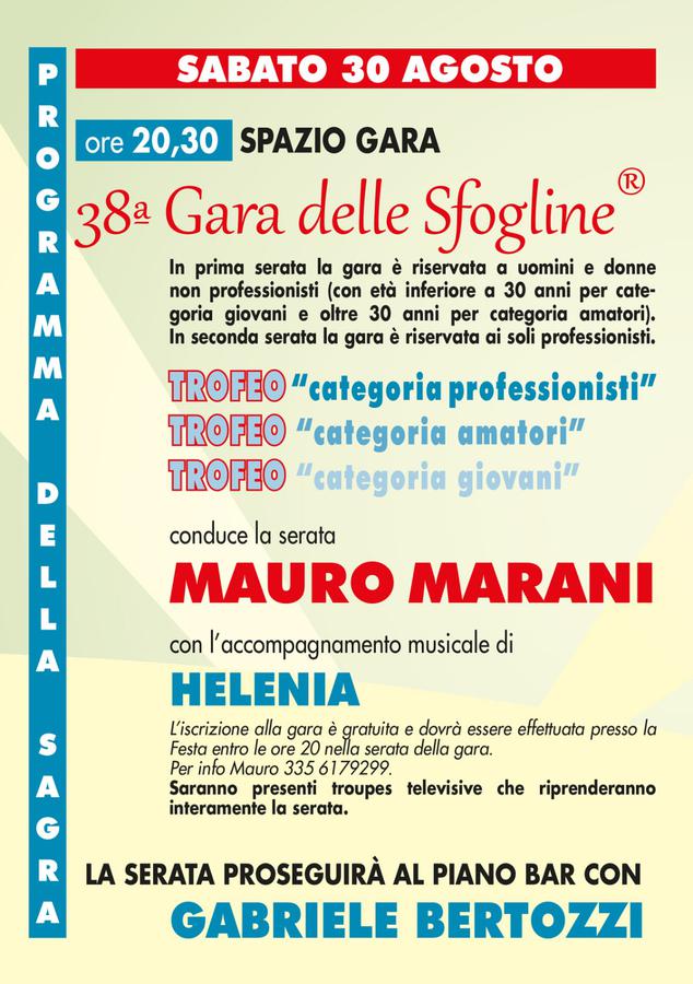 Durante la sagra ed esattamente nella serata di sabato 30 Agosto si terrà la gara delle sfogline che vedrà partecipare donne e uomini che gareggeranno per la sfoglia più rispondente alle caratteristiche principali e saranno giudicati da una giuria di esperti del settore e che proclameranno il vincitore della manifestazione.