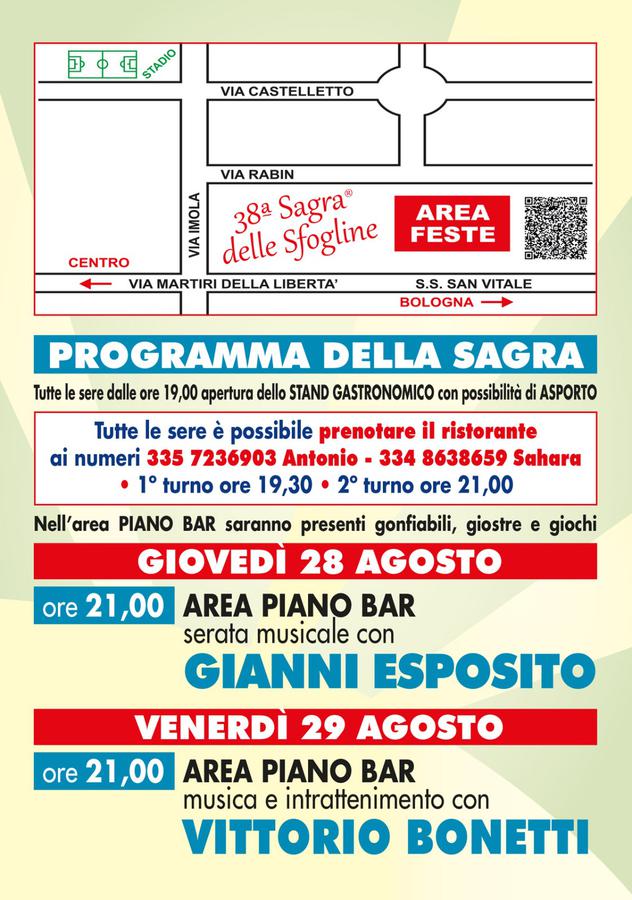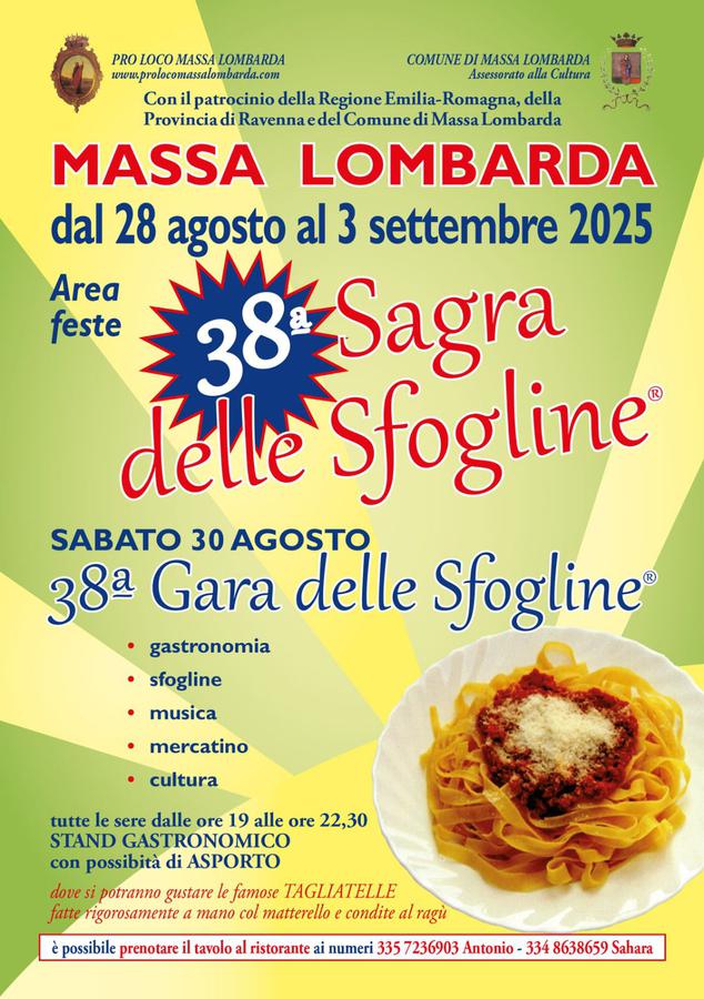 La Sagra delle Sfogline giunge nel 2025 alla sua 38° edizione, dove le sfogline, per l’appunto, professioniste e non, si sfidano a colpi di matterello nel preparare le deliziose tagliatelle, che verranno poi servite agli stand gastronomici della festa.