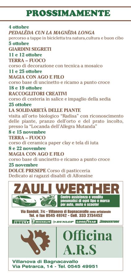 Si inizia venerdì 12 settembre con l’inaugurazione delle mostre alle ore 19.00 e la serata prosegue alle ore 20.00 con “BERBACCO CHE CENA”, incontro enogastronomico della miglior tradizione romagnola coi vini del Consorzio il Baganacavallo e la classica ospitalità alla Locanda dell’Allegra Mutanda.