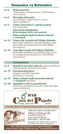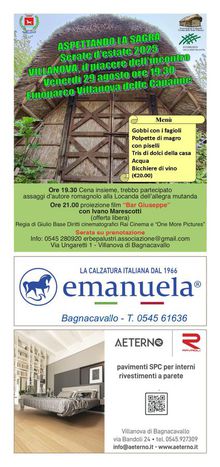 Dal 12, al 15 settembre si svolgerà a Villanova di Bagnacavallo la quarantunesima edizione della Sagra delle Erbe Palustri, iniziativa che ogni anno rievoca le antiche arti dell'intreccio, dell'utilizzo delle erbe di valle e del legno nostrano.