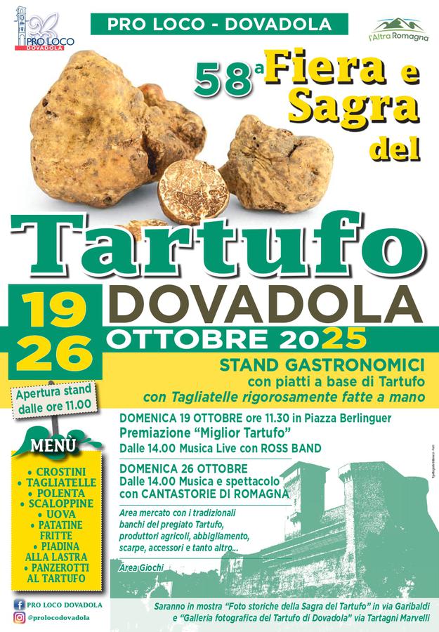 La Pro Loco di Dovadola presenta quest'anno la 58° edizione della FIERA e SAGRA del TARTUFO che si svolgerà nelle domeniche 19 e 26 ottobre 2025. La manifestazione è nata per promuovere la valorizzazione dei prodotti tipici del territorio, dal tartufo bianco pregiato ai funghi, dal miele ai formaggi, dal vino ai salumi, ecc., nonché per far conoscere ai numerosi visitatori le bellezze del territorio di questo angolo di Romagna.